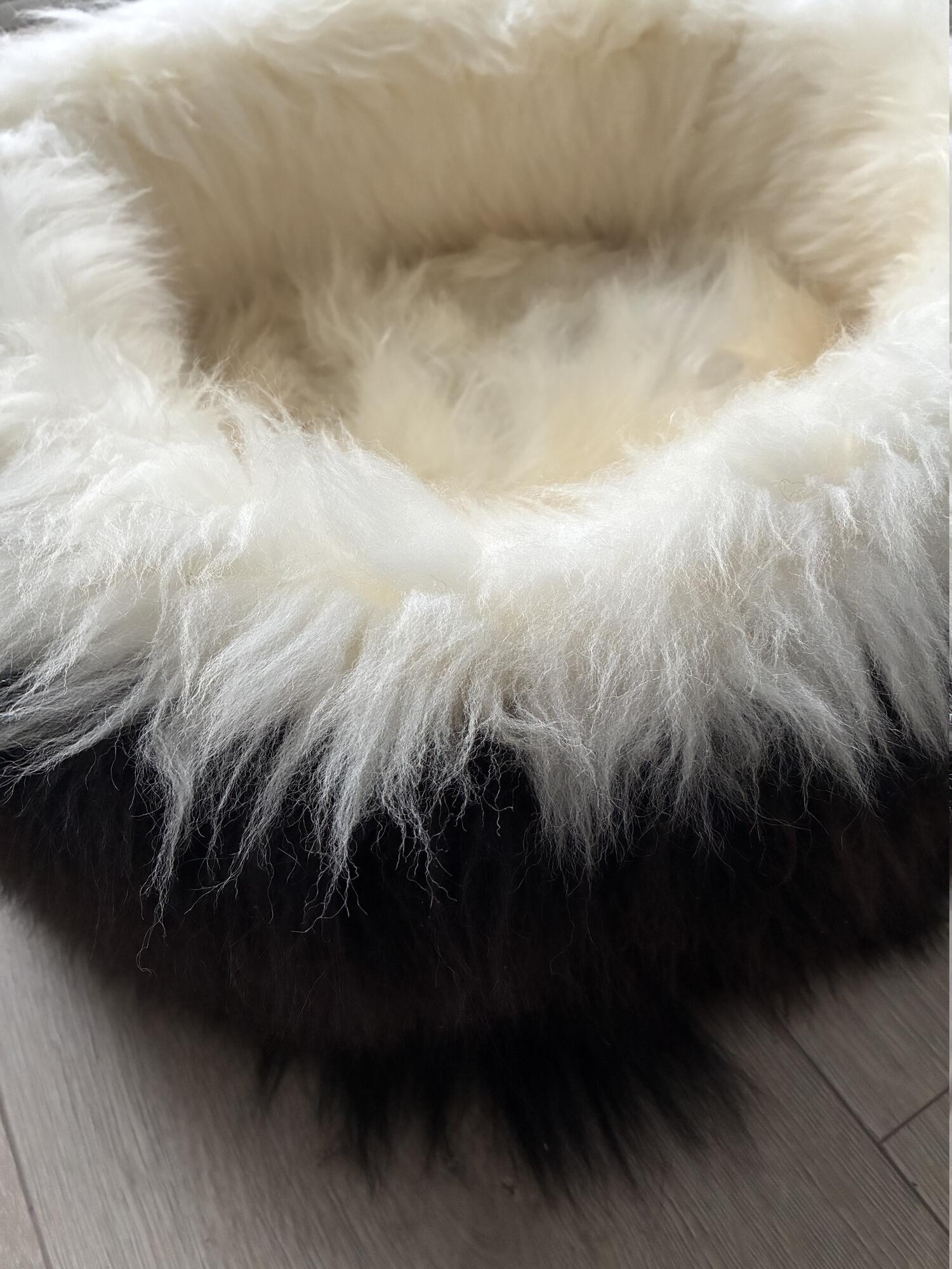 Denne luksus hundekurv er lavet af 3-4 ægte lammeskind med langt, silkeblødt hår i en unik farvekombination: varme brune nuancer og pyntet med offwhite farve på siderne..