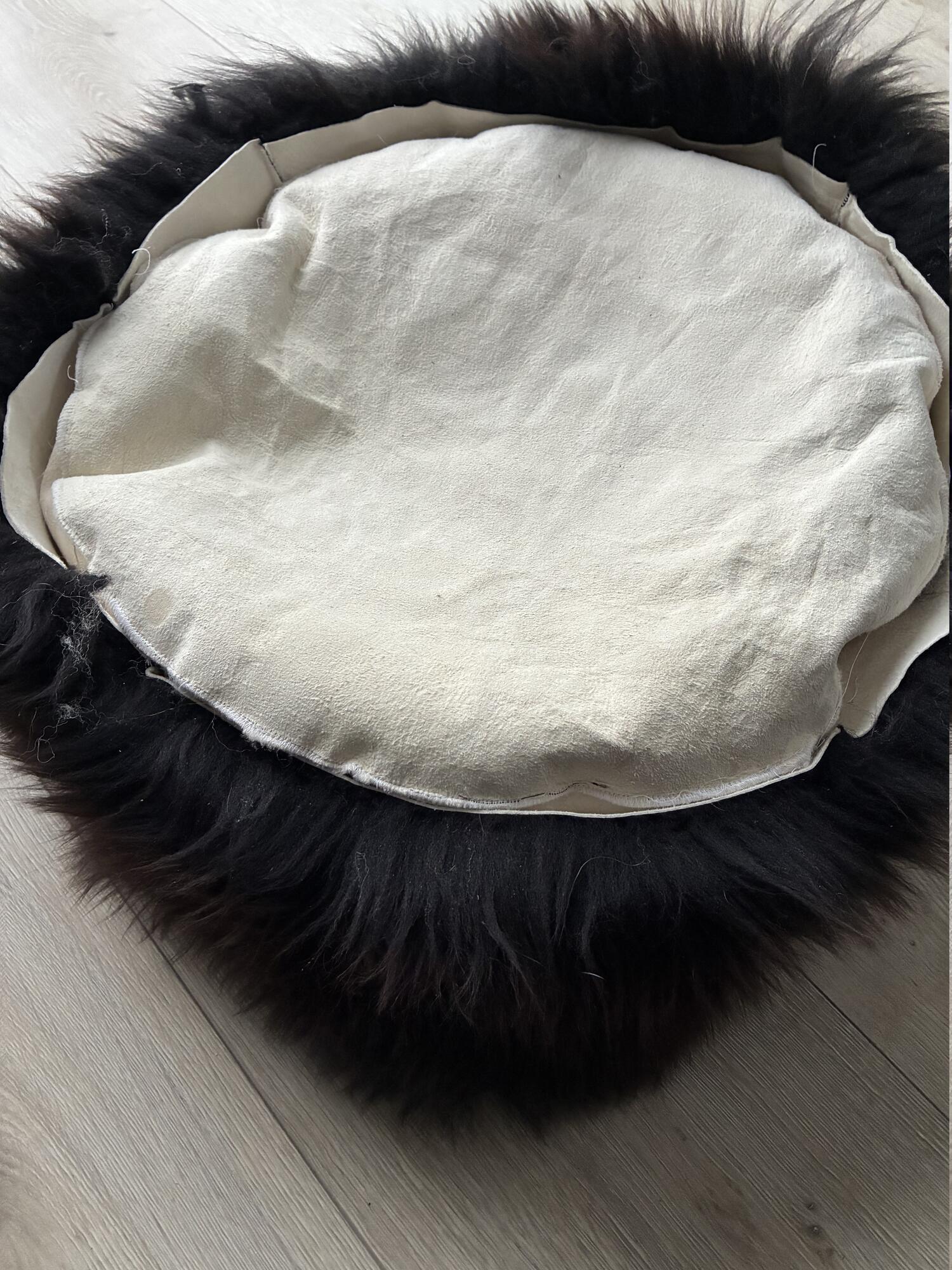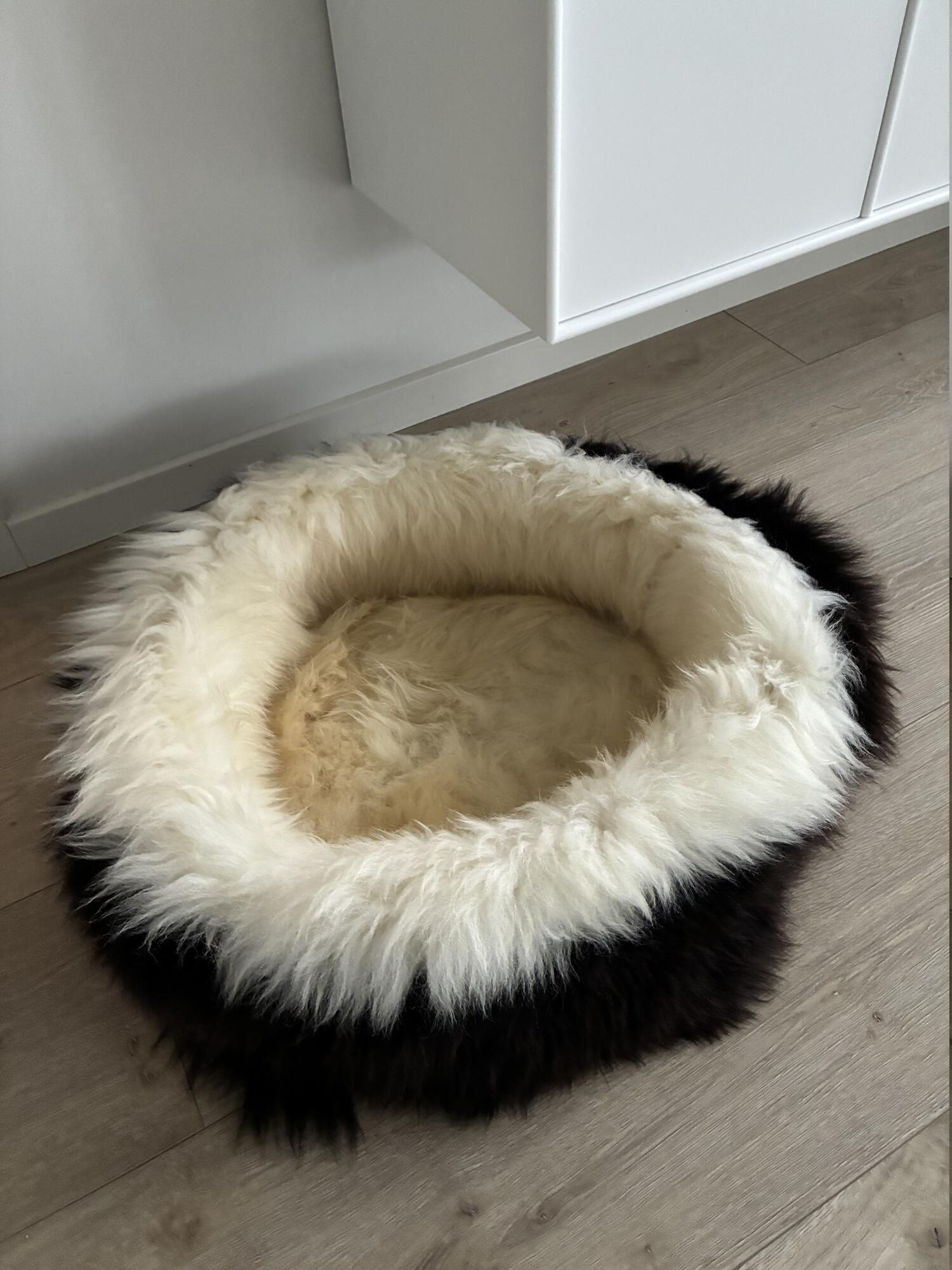 Den runde donut-form med høje kanter skaber en beskyttende og rolig base for din hund, og det naturlige lammeskind giver en utrolig blød og varm overflade.