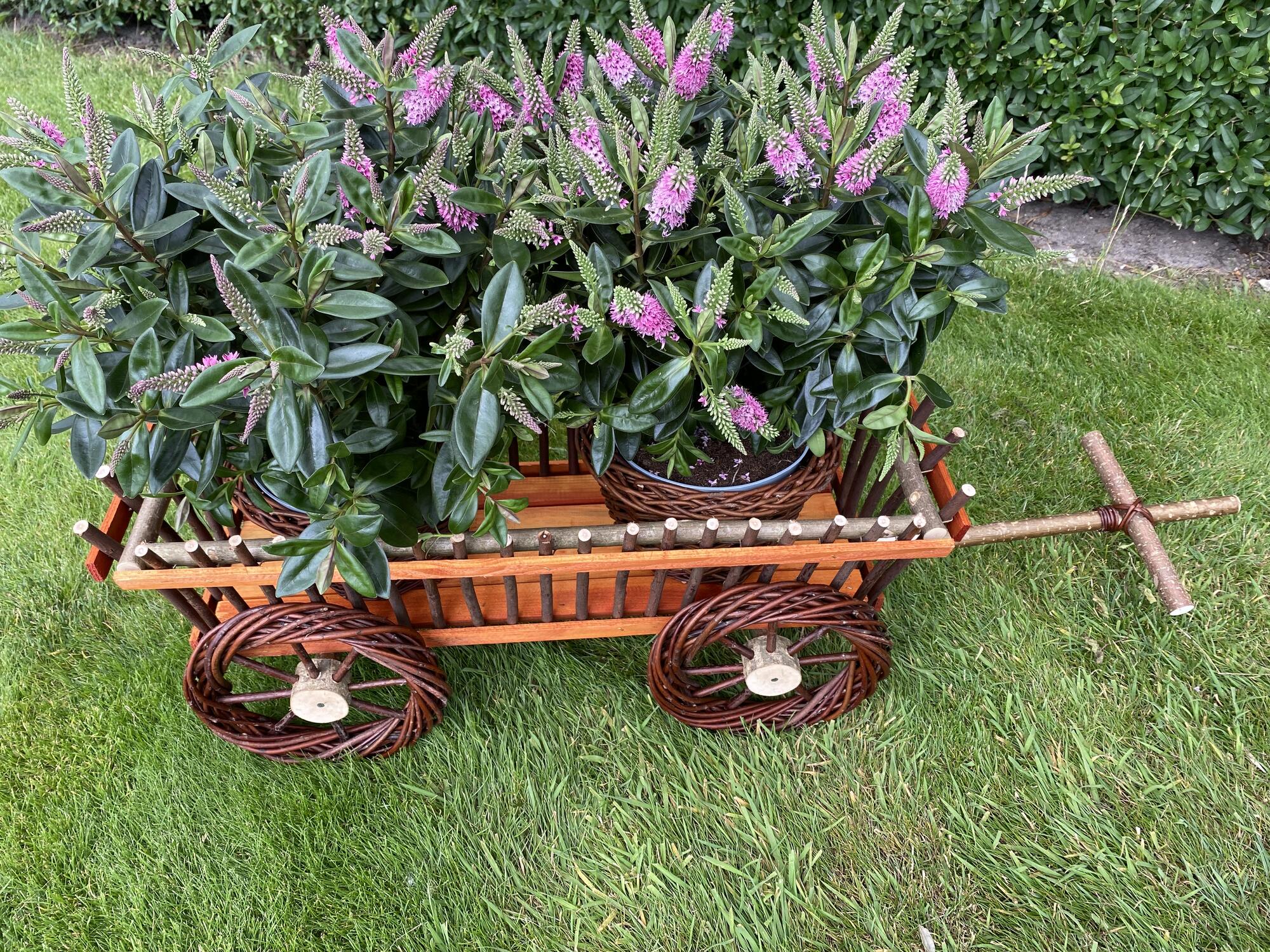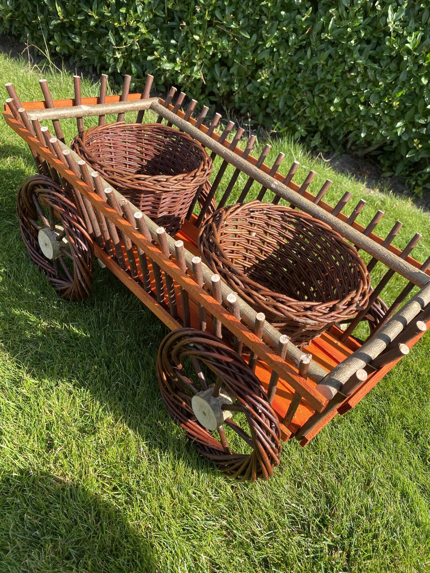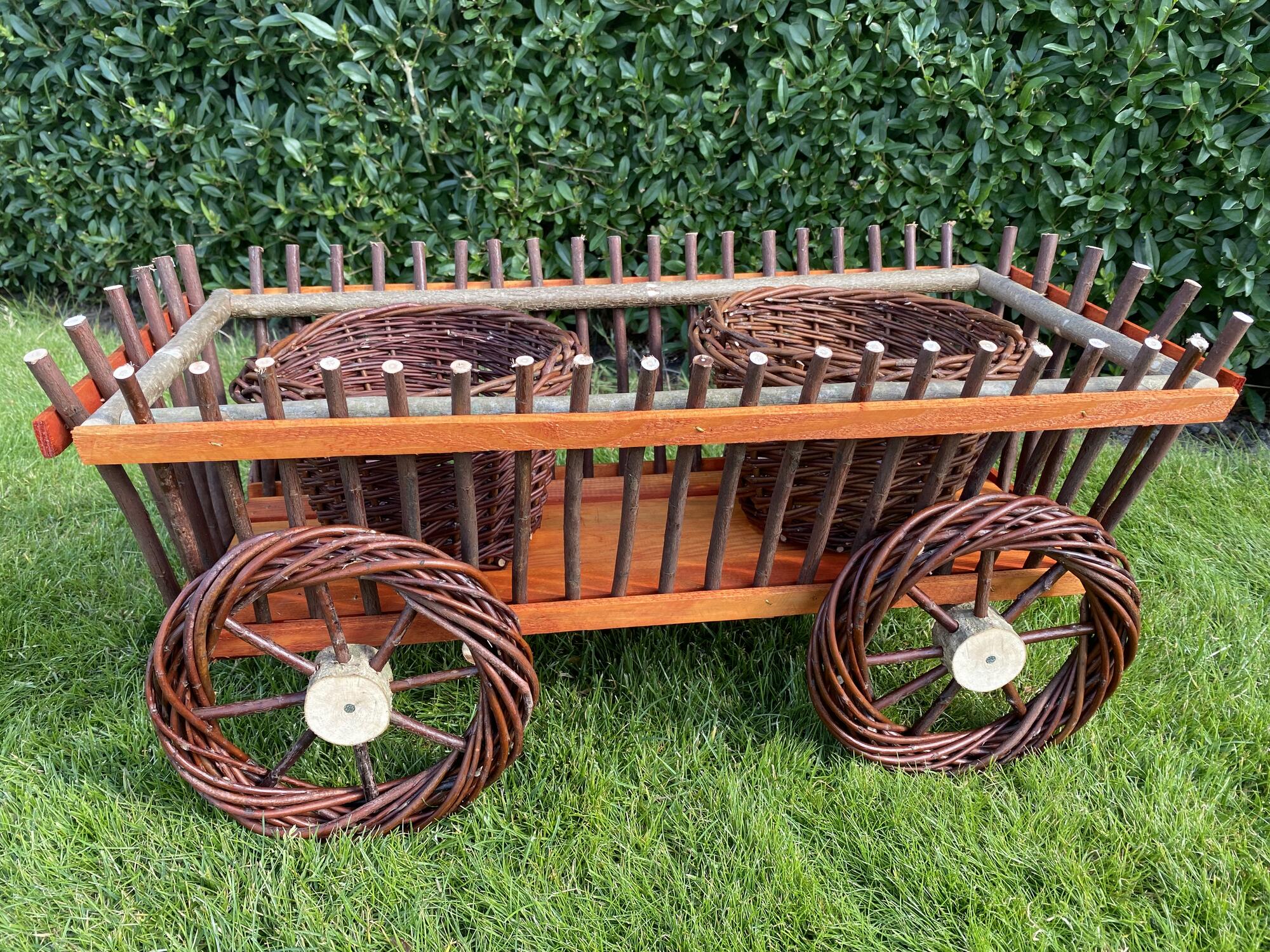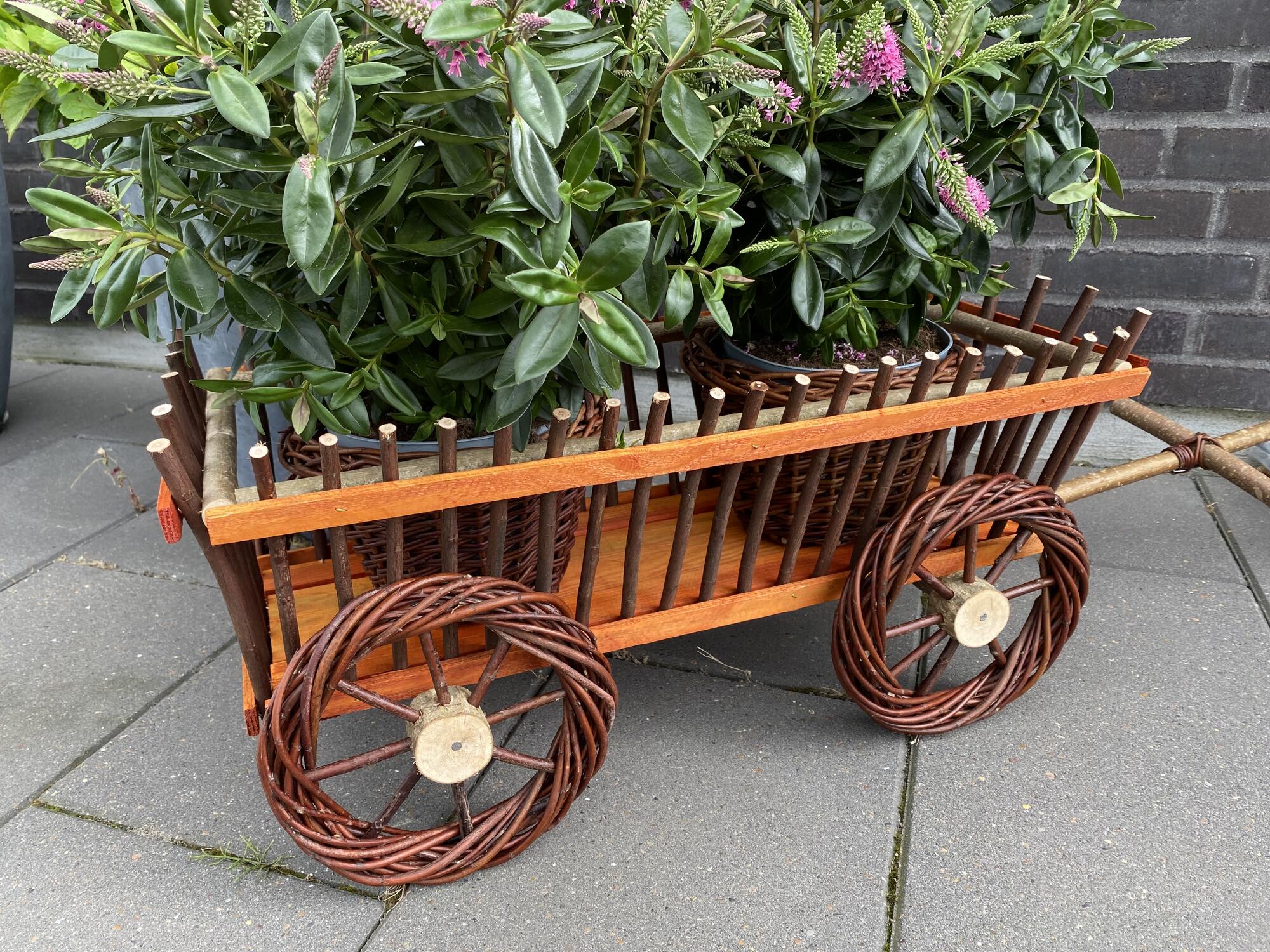 Dekorativ træ- og pilefletvogn ,med blomsterskjulere