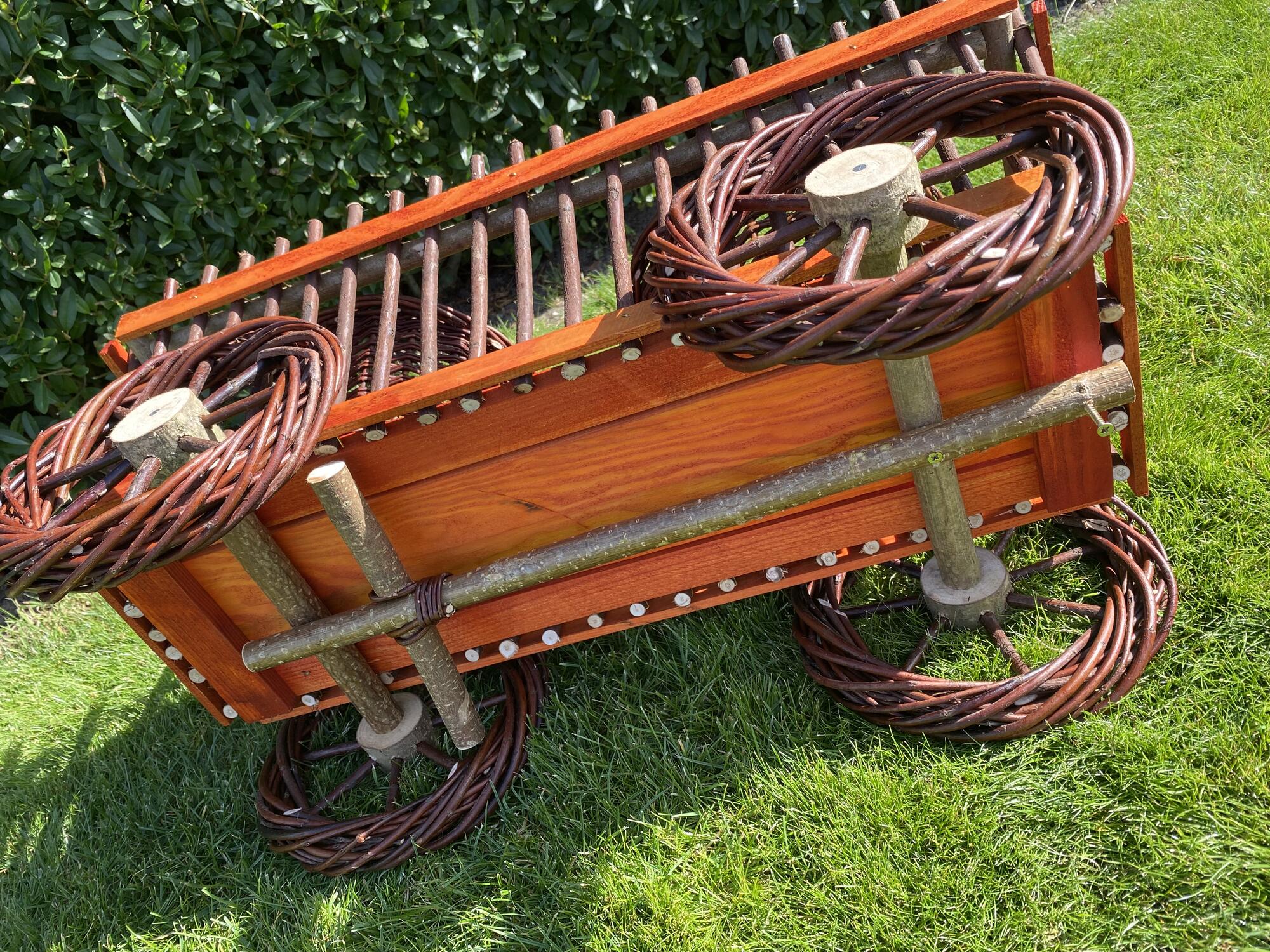 Denne vogn til blomster er en charmerende havedekoration inspireret af den klassiske ladvogn. Den kombinerer massivt træ med håndflettet pileflet, hvilket giver et autentisk, rustikt udtryk. Vognen er skabt udelukkende til dekoration og bringer varme, charme og landlig atmosfære til enhver have eller terrasse.