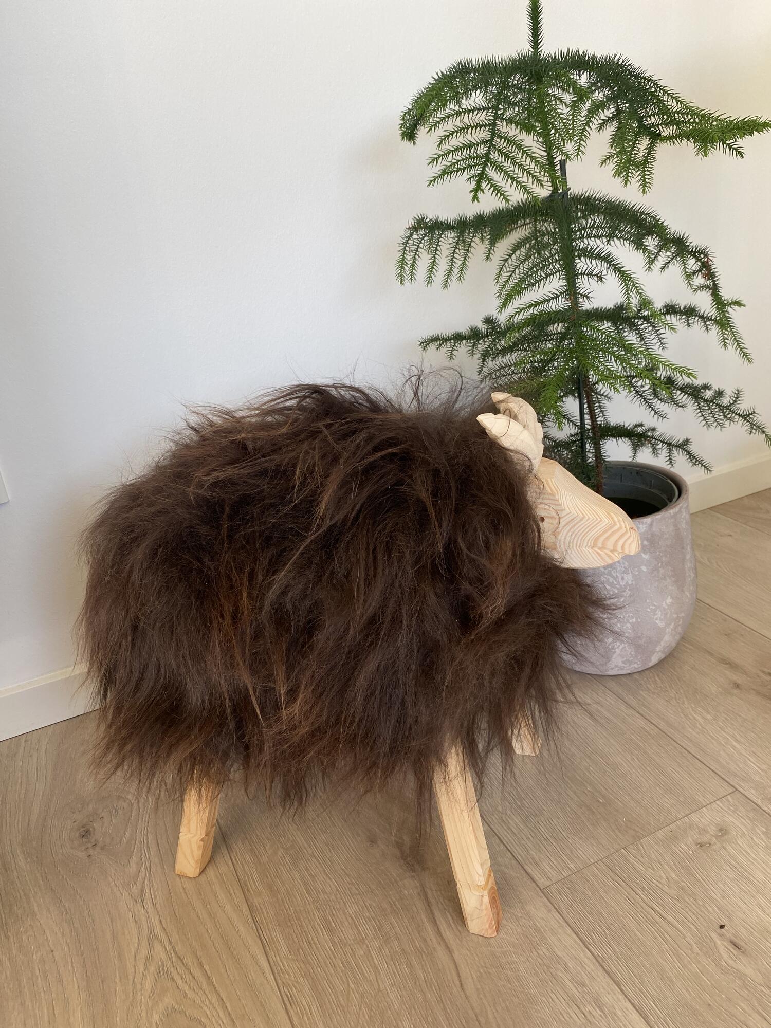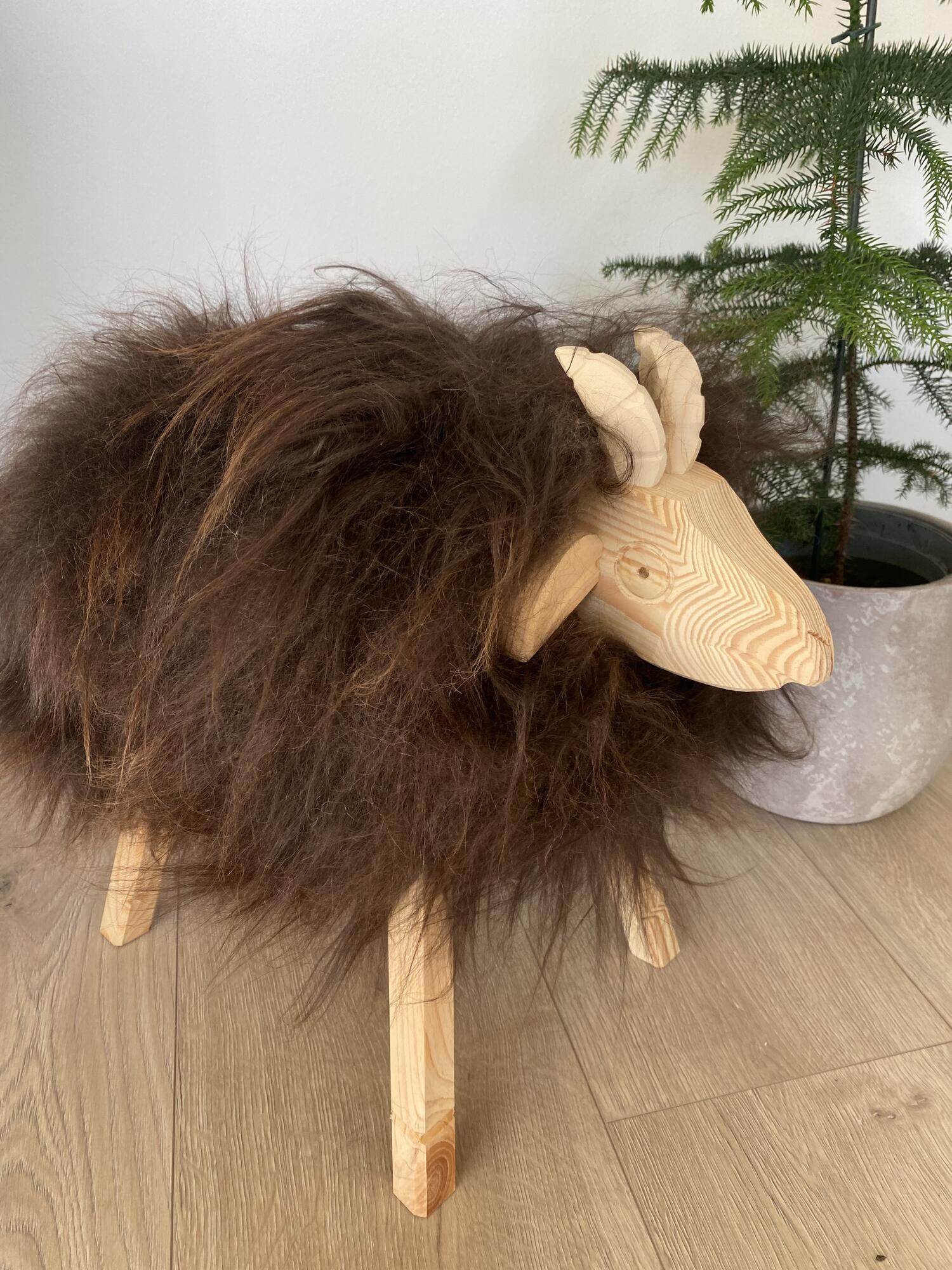 Fodskammel i naturmaterialer - Brun skammel med lammeskind og træben.